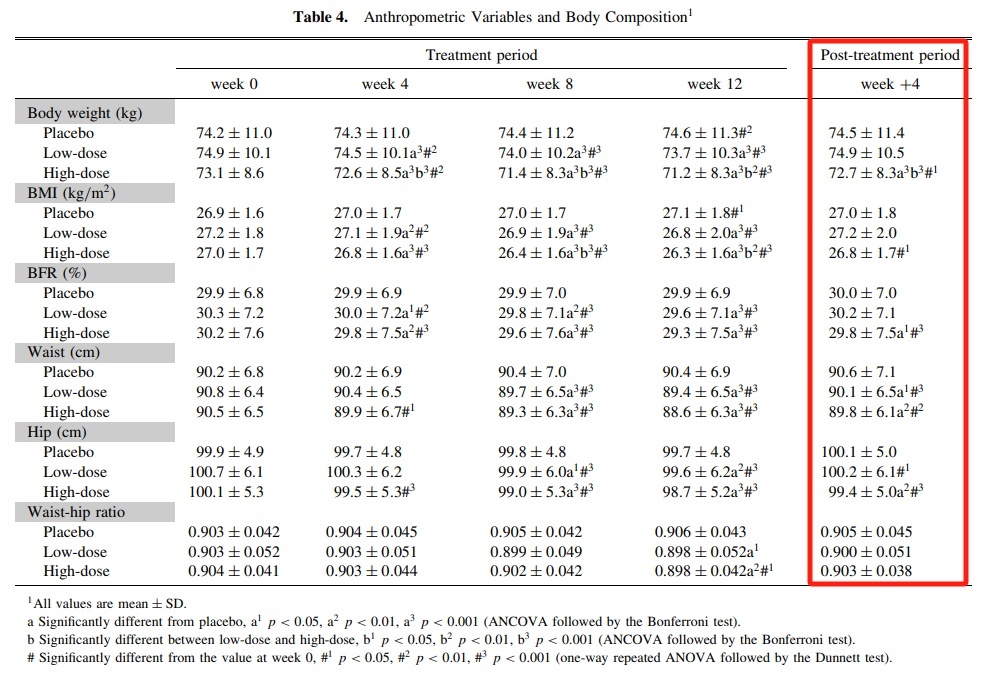 如 2009 年日本的一项小样本研究[1]将 55 名肥胖受试者随机分成 3 组,3 组受试者每天分别摄入 0 毫升、15 毫升、30 毫升的苹果醋。实验周期为 12 周,再加 4 周的后续观察。从最终数据来看,在 12 周的时间里,苹果醋貌似起到了帮助减肥的作用。但后续 4 周的观察中发现,体重、腰围、腰臀比、BMI均有反弹迹象。